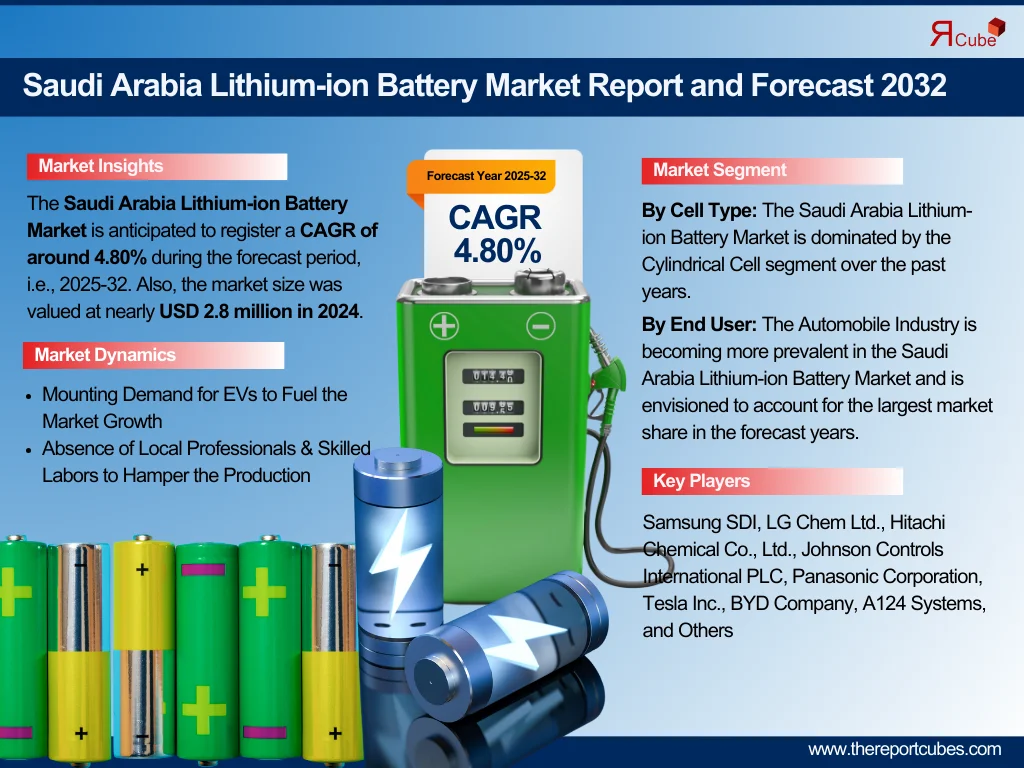 The Report Cube which is one of the leading market research company in UAE expects the Saudi Arabia Lithium-ion Battery Market to grow at a CAGR of around 4.80% through 2032, as highlighted in their latest research report. The study provides an in-depth analysis of the emerging trends shaping the Saudi Arabia Lithium-ion Battery Market and offers detailed forecasts for its potential growth during 2024–2032. The report also presents a comprehensive assessment of the competitive landscape, including profiles of leading players, their performance metrics, and recent strategic developments. Additionally, it explores the key market drivers, challenges, opportunities, and provides insights into historical and future revenue trends at the global, regional, and country levels.